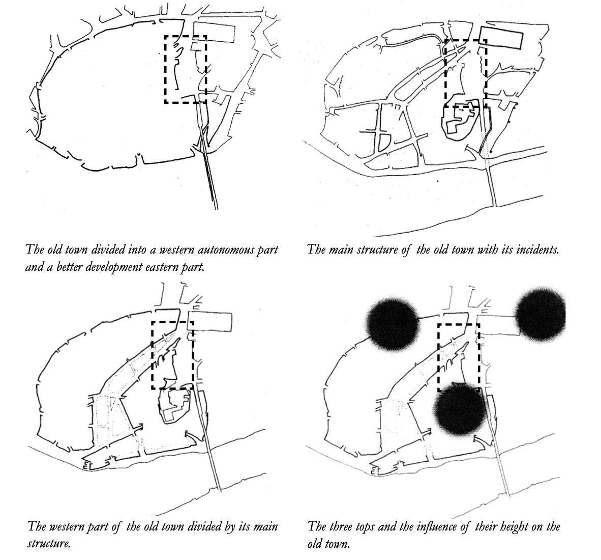 Fig. 3 highlights several morphological characteristics of the old inner city of Porto that put the study area (indicated in fig. 3, ed.) in perspective. Figs. 4 and 5 show the design proposal and how this is related to the morphology of the area.