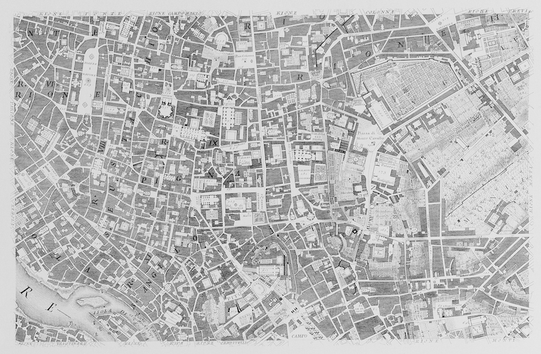 When most city maps were still bird’s eye perspective views, Giambattista Nolli produced a map of 18th century Rome which greatly reduced and systematised the information contained in the map (fig 12.1). Nolli limited himself to a 2d representation and only distinguished between public space (white) and private space (black). As a result, publicly accessible interior spaces like churches are visible in the map. Through reduction and abstraction, knowledge which otherwise remains hidden under the surface is instantly accessible. This is one of the basic goals of any analysis. Over the last decades, the Nolli map has mesmerised generations of urban designers, theorists and architects. Especially since the publication of “Learning from Las Vegas” (which also usedthe Nolli technique) dozens of “Nolli maps” have been produced.