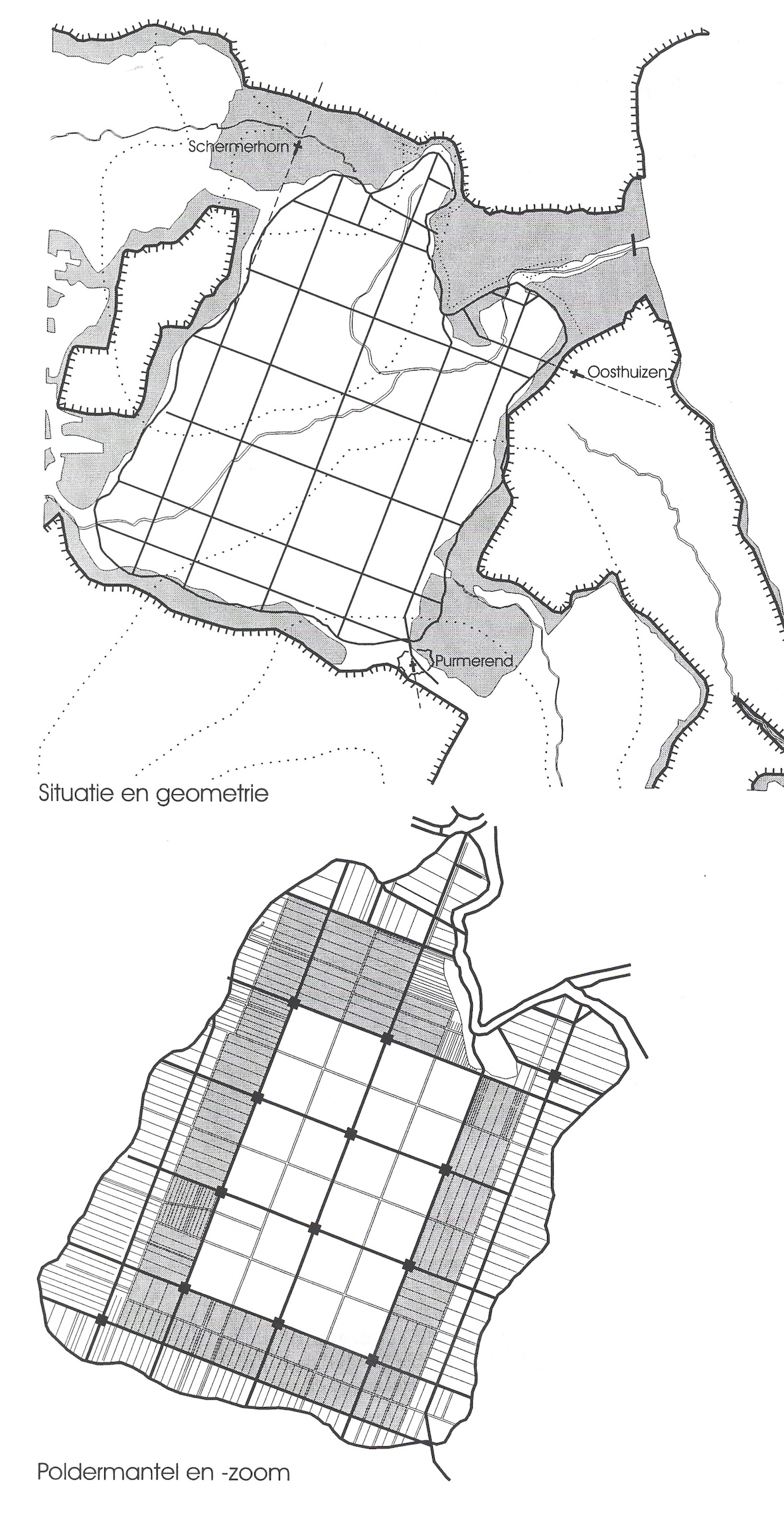 Fig. 5 shows a number of polders and the basic units which are part of their grid. The Beemster is used as an example to illustrate this. The grid of the Beemster has several layers. This is illustrated in figs. 6 and 7. The authors claim that even the internal structure of a single farm is connected directly to the higher grid levels. The overall layout of the polder is visualised in fig. 10. These simple, yet beautiful drawings immediately convey an image of what kind of place the Beemster is. Unfortunately, the measure with which the height was exaggerated is not indicated. One might think that the Beemster is actually that small. The drawings in this study are extremely clear and instructive. They have the power to give insight into a complex phenomenon in a short time. Exactly what an analysis should do.