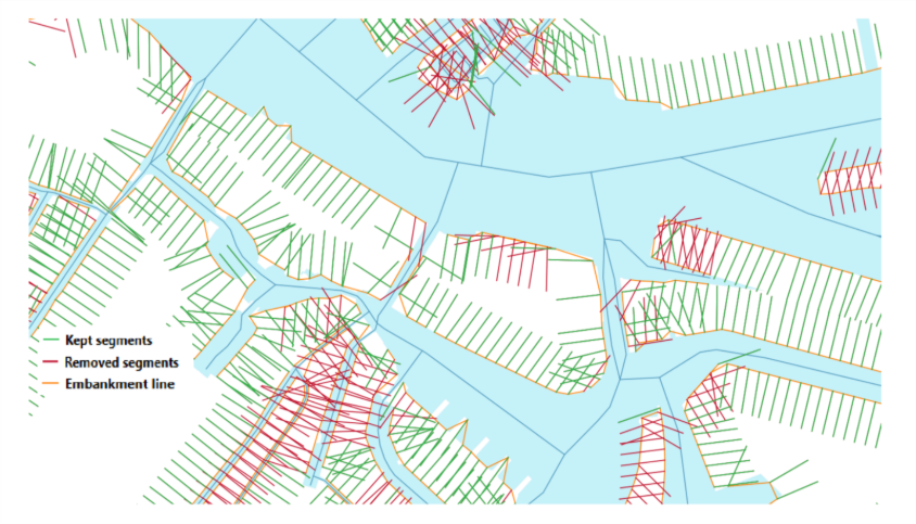 This example of student work used quantitative typology construction analyse data collected from river cross-sections. The initially generated cross-sectional segments were cleaned before analysis, removing any deemed invalid, for examples, those cutting through another river’s embankment line (Figure 5.2).